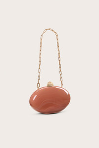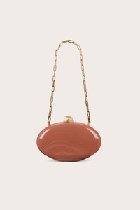 A marbled acrylic oval shaped clutch with an abstract gold top closure and removable chain strap. — Marbled acrylic — Gold toned hardware — Removable chain strap — Clutch design — Top closure COMPOSITION AND CARE 100% ACRYLIC, 100% BRASS