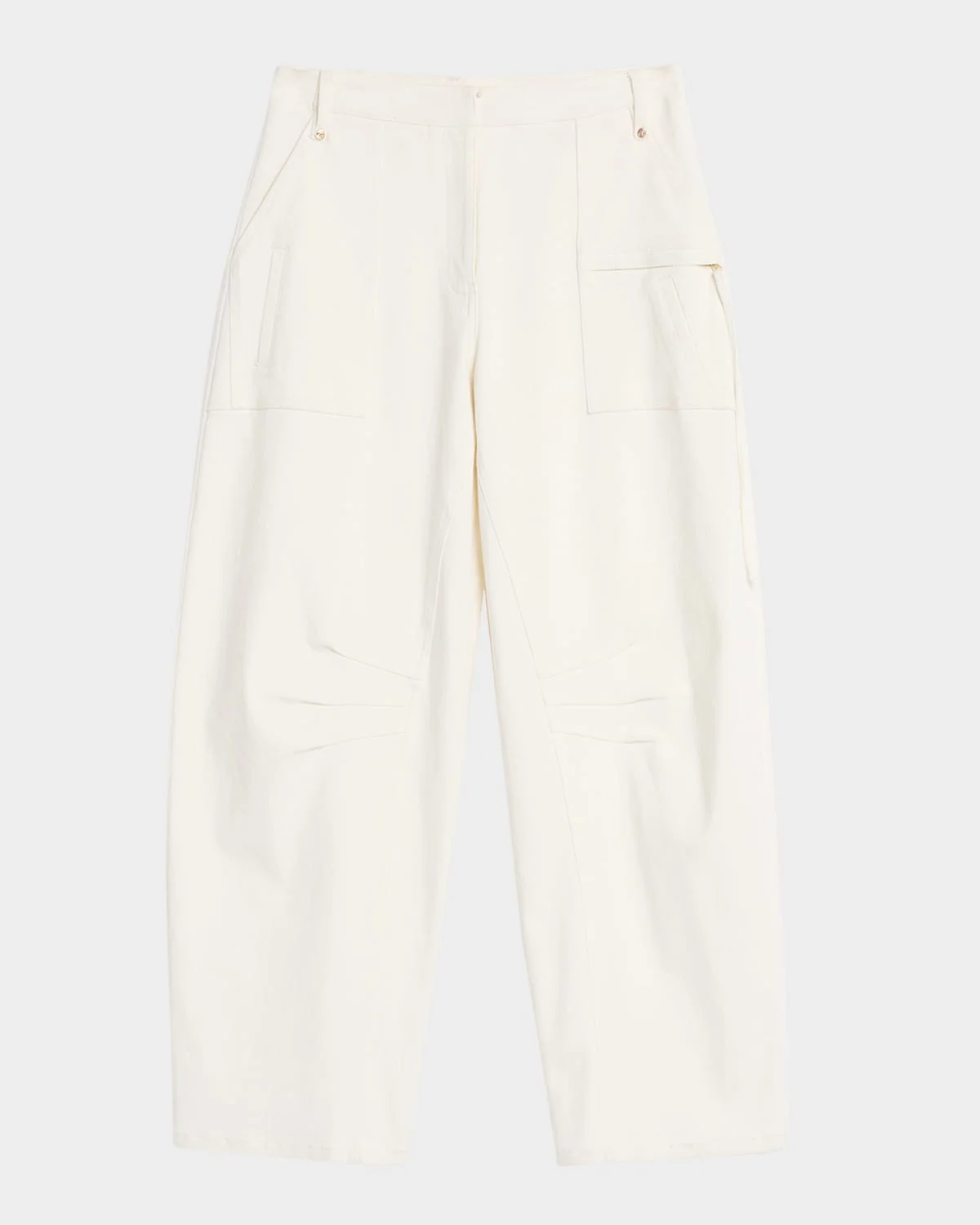 - Crafted from cotton twill with slight stretch, the Ewa pants by Cult Gaia offer a modern take on utility pants with a barrel-leg silhouette - Mid rise sits high on hip - Front and back patch pockets - Wide legs - Full length - Hidden hook/zip fly; belt loops - Cotton/spandex - Dry clean - Imported