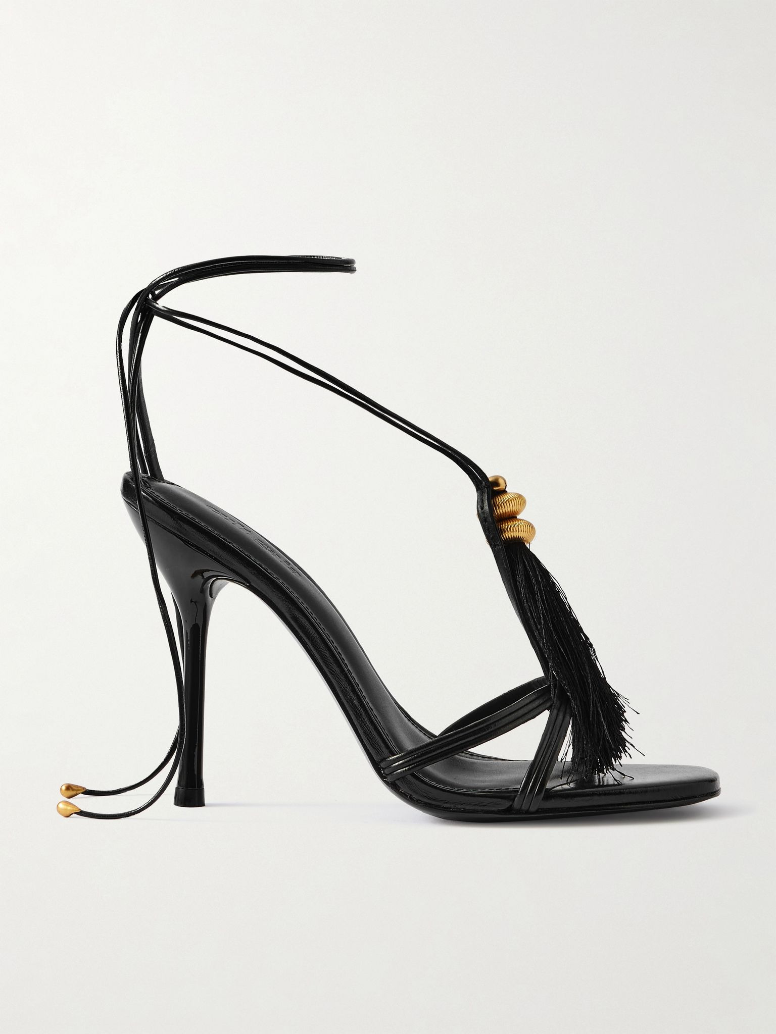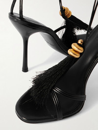 Cult Gaia's 'Farah' sandals have gold-tone beads and playful tassels adorning the slim straps, making every step feel fun and playful. They're made from leather and set on 105mm heels. Size & Fit - Fits true to size, take your normal size - Italian sizing Details & Care - Heel measures approximately 105mm/ 4 inches - Black leather (Calf) - Ties at ankle