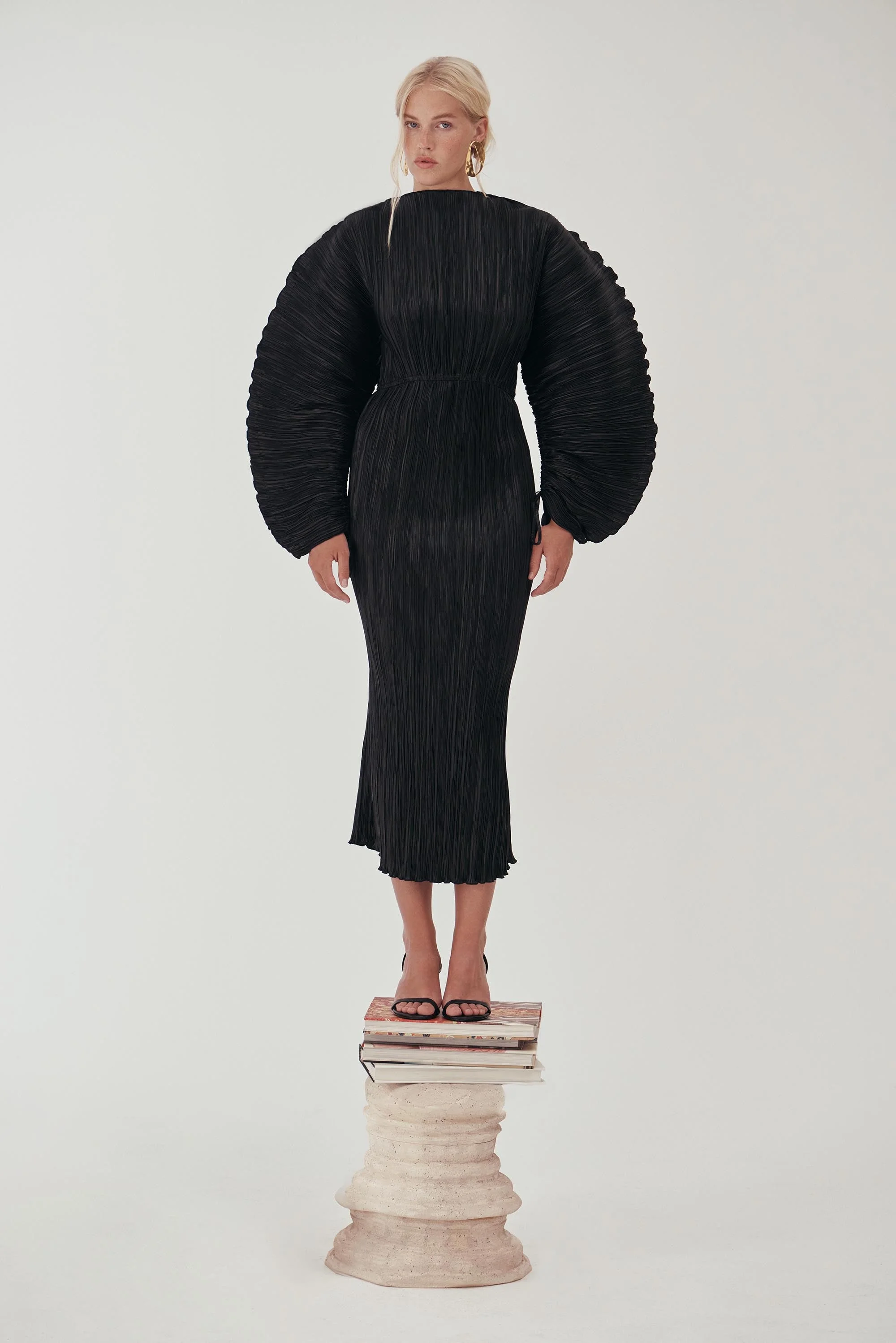 An elegant plisse midi dress with a rounded blouson sleeve. — Plisse — High neck — Elastic at sleeves and waist — Rounded sleeve SIZE & FIT NOTES Model is 5'10" and wearing a size Small COMPOSITION AND CARE 100% POLYESTER Dry Clean Only