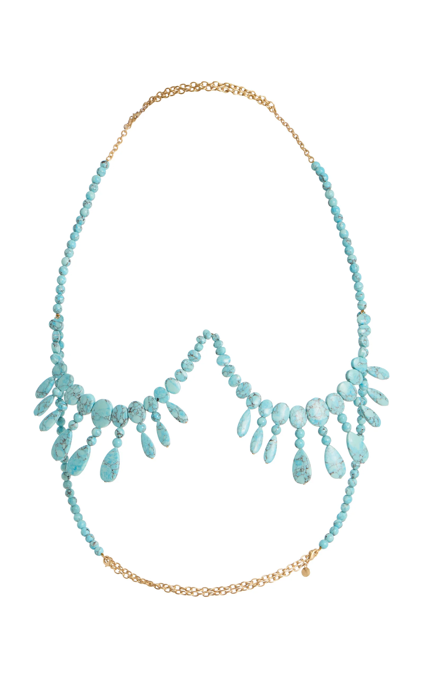 L.A.-based Jasmin Larian Hekmat, the brains behind the cult-favorite Ark bag, returns with more ultra-desirable accessories in her Cali-infused, bohemian style. 'Gabrie' is a halter-neck bralette strung with faux turquoise stones. PRODUCT DETAILS - Clasp fastening - Composition: 100% faux resin stone; Hardware: 100% brass-plated metal - Designer color: Ibiza Turquoise - Imported
