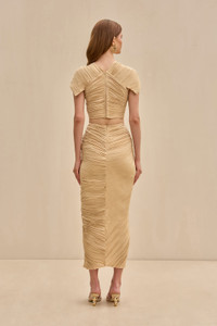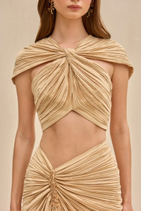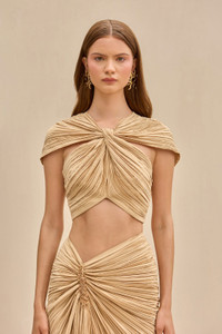 A cropped plissé top in our signature pleated satin with a front twist detail and cap sleeves. — Cropped length — Pleated satin — Cap sleeves — Back zipper FIT NOTES Model is 5'11" and is wearing a size Small COMPOSTION AND CARE 100% POLYESTER