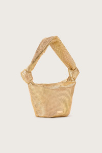 Designed in a golden-hued chainmail body, the Gia Bag fits snugly over your shoulder or easily in the palm of your hand. A coordinating chainmail strap features knotting detailing at the body. A zipper closure spans from end to end of this slouchy, horned body. A round base makes this bag a perfect display piece. FIT NOTES Zipper closure Fits a phone WIDTH 4.13 Inches HEIGHT 6.49 Inches LENGTH 5.70 Inches COMPOSTION AND CARE 100% Aluminum Trim: 100% Lamb Leather Lining: 90% Polyester 10% Polyurethane