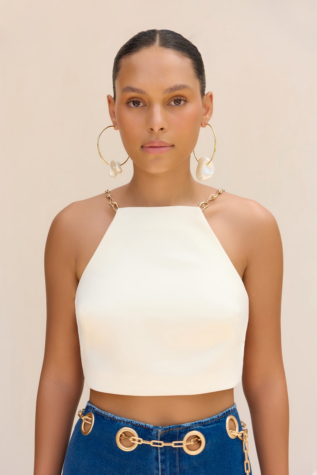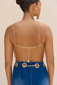 An open back cropped top with a chain halter neck that connects to a back adjustable back chain. — High neck — Cropped length — Chain straps — Open back SIZE & FIT NOTES Model is 5'10" and is wearing a size Small COMPOSITION AND CARE 93% POLYESTER 7% SPANDEX