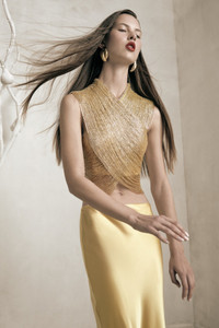 Preorder - Estimated Ship Date is Between October 31st and November 7th An artisanal top rendered in hand beaded arcs crossing over the torso. — Hand beaded — Mesh underlayer — Central back zipper — Cropped length SIZE & FIT NOTES Model is 5'10" and wearing a size 4 COMPOSITION AND CARE 100% GLASS BEADS SPOT CLEAN ONLY