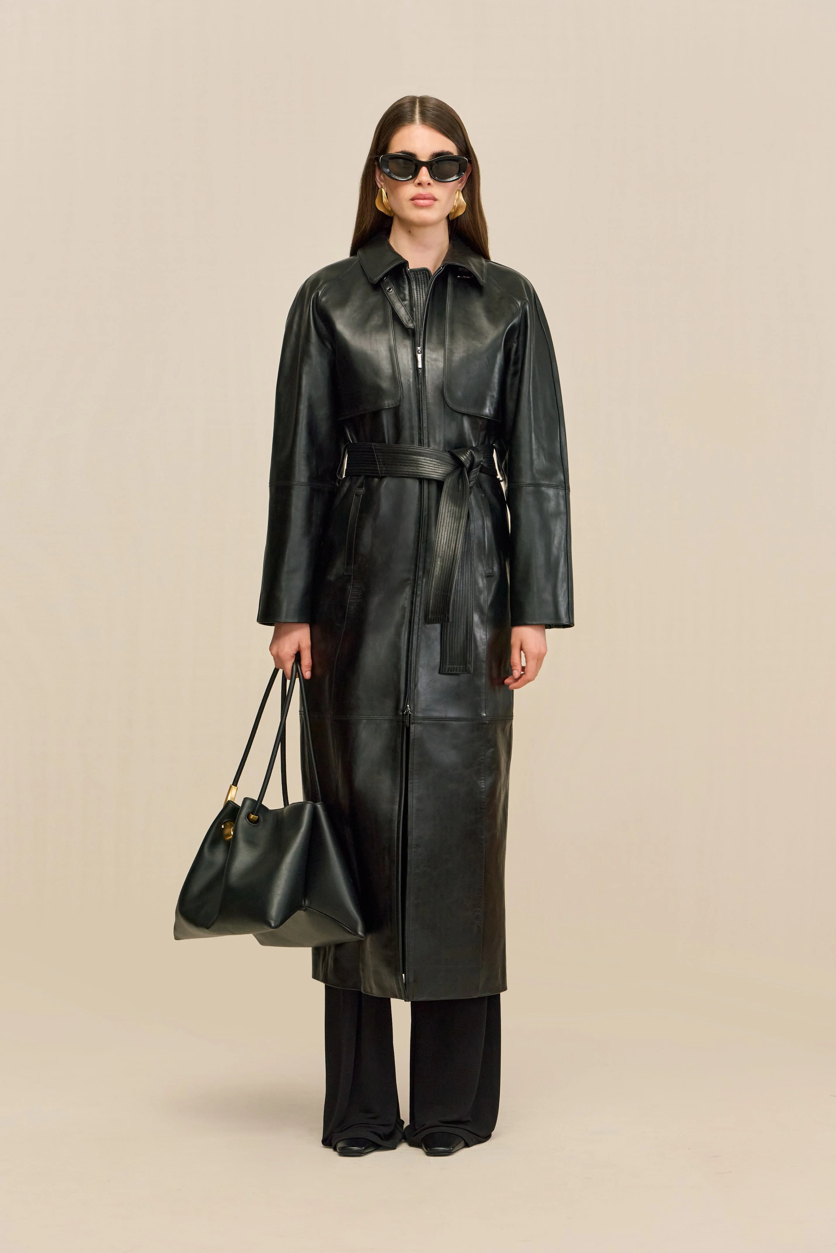An ankle length coat crafted out of smooth leather, featuring functional pockets and an adjustable tie at the waist. — Leather — Ankle length — Functional pockets — Front zipper — Adjustable waist tie SIZE & FIT NOTES Model is 5'10" and wearing a size Small COMPOSITION AND CARE 100% LAMB LEATHER