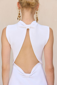 A knit mini dress featuring an open back with bow details. — Mini length — Mock neck — Double bow details in back — Flattering knit blend — Zipper closure on shoulder SIZE & FIT NOTES Model is 5'10" and wearing a size S COMPOSITION AND CARE 53% RAYON 46% NYLON 1% SPANDEX