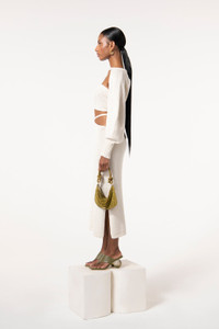 The minimalistic silhouette created by this stretch tape yarn knit skirt is heightened by the gorgeous diamond shaped embellishments at the midsection. Crossing and creating geometric, skin-bearing shapes with a thin ribbon-like knit accoutrement, this timeless neutral-hued skirt is a captivating number. Wear with the Sally Top for a look that both alluring and chic. FIT NOTES Model is 5'9" and is wearing a size Small Length: 34 1/2" Ties at waist Side cut outs at hip Side slit at hem Single-layer tape yarn Runs slightly larger, we recommend sizing down COMPOSTION AND CARE 77% Cotton, 22% Polyester