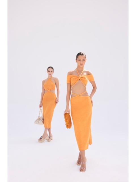 This stretch knit skirt has an effortless, minimalistic silhouette that’s heightened with gorgeous diamond shaped embellishments at the midsection. Crossing and creating geometric, skin-bearing shapes with a thin ribbon-like accoutrement, this timeless neutral skirt is a captivating number. Paired with the Heather Top or Cessaly Top, the Hedda showcases the feminine figure beautifully. FIT NOTES Model is 5'8" and is wearing a size Small Length: 34 1/2" Ties at waist Side cut outs at hip Side slit at hem Single-layer tape yarn Runs slightly larger, we recommend sizing down COMPOSTION AND CARE 77% Cotton, 22% Polyester