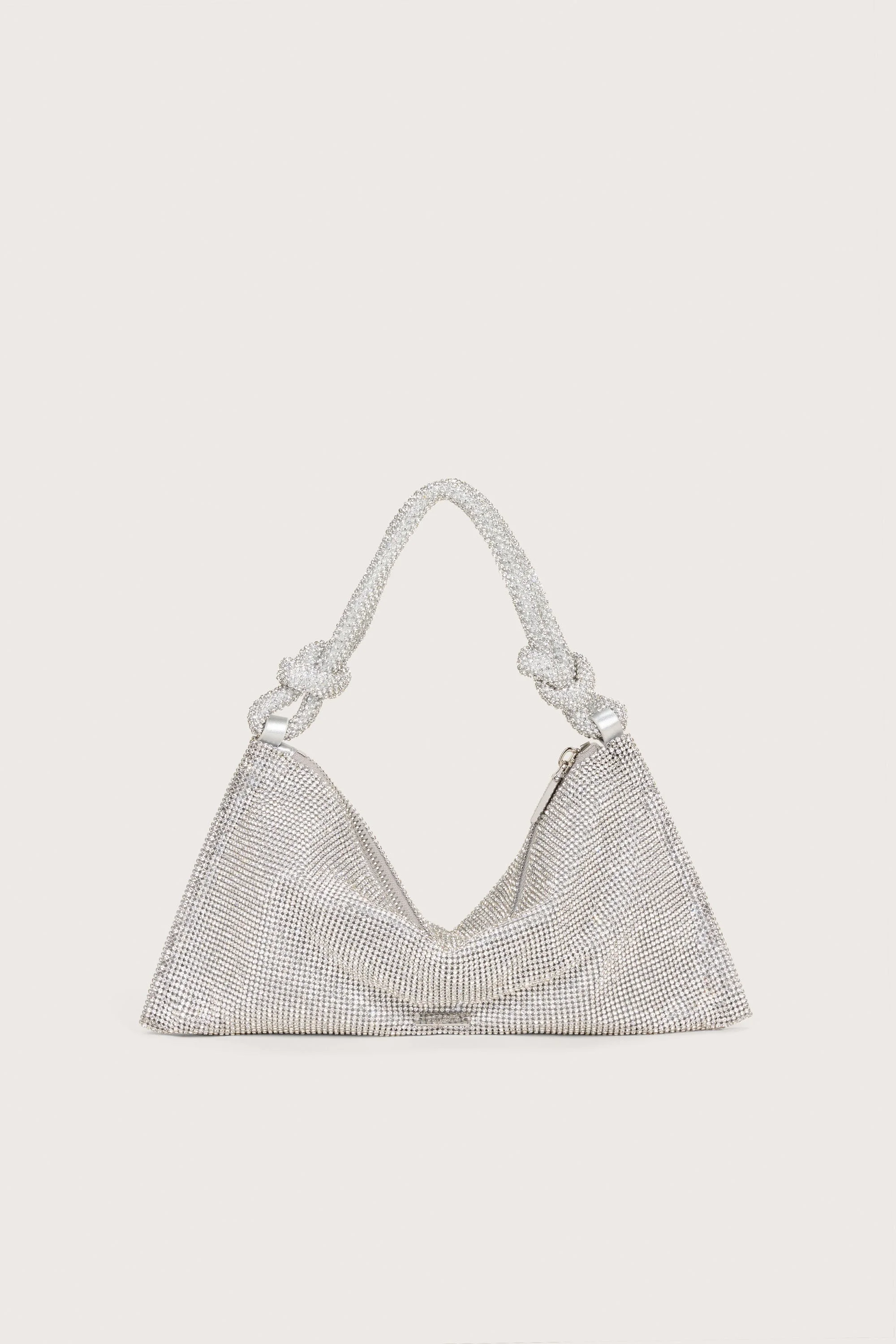 The Hera Shoulder, now available in an even smaller Nano. Crafted from eye-catching rhinestone that give a metallic silver shine, this classic design exudes femininity and grace with a knotted shoulder strap and a gorgeously slouchy silhouette. The frosted handheld bag is the perfect addition to add some Gaia sparkle to your life. Please note this size is much smaller than the Mini. SIZE & FIT NOTES Fits largest iPhone Top zipper closure Fully lined O-rings COMPOSITION AND CARE .25" x 6" x 11" Handle Drop: 9" Weight: 21.5 g Body: 100% Plastic Lining: 100% Polyester Handle: 100% Plastic