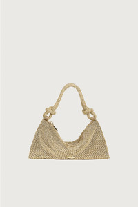 The Hera Shoulder, now available in an even smaller Nano. Crafted from eye-catching light gold-hued rhinestone that give a metallic golden shine, this classic design exudes femininity and grace with a knotted shoulder strap and a gorgeously slouchy silhouette. The frosted handheld bag is the perfect addition to add some Gaia sparkle to your life. FIT NOTES 5.51" x 11.02" COMPOSTION AND CARE 100% Plastic Lining: 90% Polyester 10% Polyurethane Trim: 100% Plastic