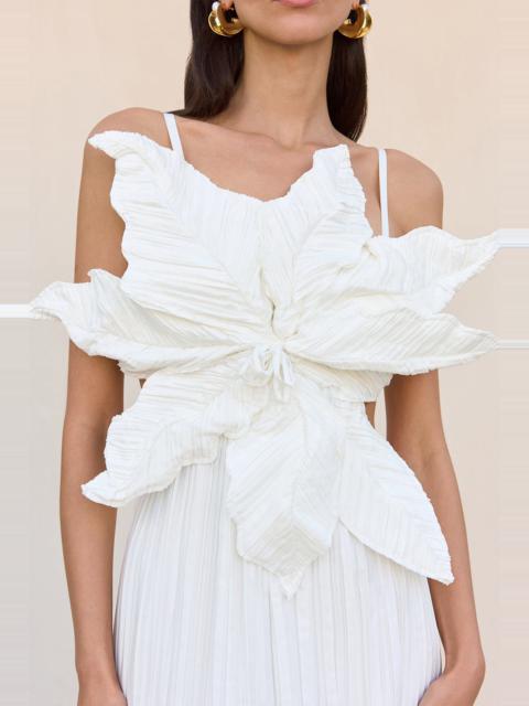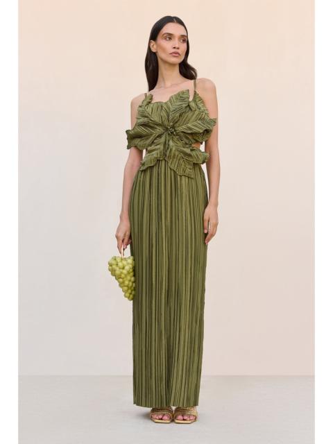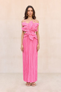 A floor length gown in signature plisse with a center bust wired flower accent. — Maxi length — Signature plisse — Wired flower petals — Adjustable straps — Back cutout with central zip