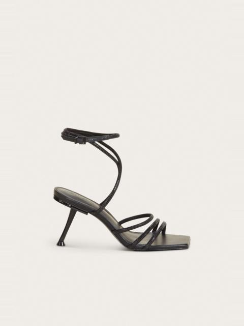 This classical sandal features slender black rhinestone adorned wrap-around strapping that works up from the toe to the high-ankle. The thin heel gives a lift effect. Her square toe balances the thin details of this gorgeous sandal. Her rubber sole at the toe keeps you grounded. FIT NOTES Lace-up style Buckle closure at ankle Square toe COMPOSTION AND CARE Heel height: 3.5" Body: 60% Polyester, 40% Glass Stones Sole: 100% Leather Heel: 100% Iron