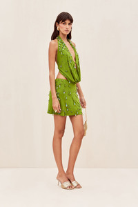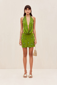 The Issey Dress features droplet-shaped iridescent glass beads of various sizes that are hand-sewn to give the effect of rain. Her deep V-cowl neck supported by a slender bridge of fabric across the bust. This bar of fabric across the bust allows this dress glorious movement, while guaranteeing coverage. Her stretch jersey fabric is lined. She has an elastic band across the mid-back and a side zip in skirt to provide easy wear. SIZE & FIT NOTES Model is 5'11" and is wearing a size Small COMPOSITION AND CARE 100% Viscose