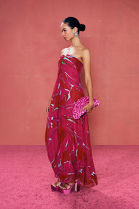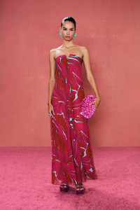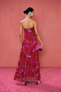 Janelle is an ultra-flowy gown in marshmallow chiffon featuring a fitted boddice with a sharp, triangular cutout at the central bust that compliments the spread of the ankle-length hem. A back zip allows for easy fit. Her semi-sheer chanterelle pink fabric adds even more movement to this gorgeous gown. FIT NOTES Runs large, we recommend sizing down 2 layers of lightweight chiffon p.p1 {margin: 0.0px 0.0px 0.0px 0.0px; font: 13.0px 'Helvetica Neue'} Inside stretch mesh corset Mini dress lining Center back zipper COMPOSTION AND CARE 100% Polyester