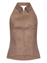 zip-up halterneck vest Highlights - Sesame beige - Classic collar - Front zip fastening - Dart detailing Imported Composition Linen/Flax 51%, Rayon 47%, Spandex/Elastane 2% Washing instructions Read Manufacturer Guidelines