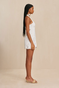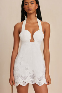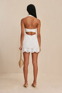 Preorder - Estimated Ship Date Between April 11th to April 25th A halter style linen mini dress with structured keyhole neckline and embroidered, scalloped hem. — Wire shaped halter neckline — Closure at neck and back — Scalloped hem with embroidered detailing — Linen FIT NOTES Model is 5'10" and is wearing a size 4 COMPOSTION AND CARE 100% LINEN