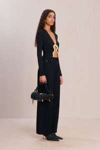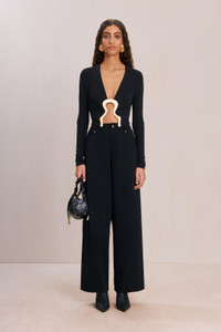 A long sleeve crop top with sculptural hardware cutout at the center bodice. — Long sleeve — V neckline — Center bodice cutout with gold hardware — Cropped length SIZE & FIT NOTES Model is 5'10" and is wearing a size Small COMPOSITION AND CARE 100% VISCOSE