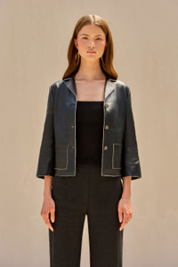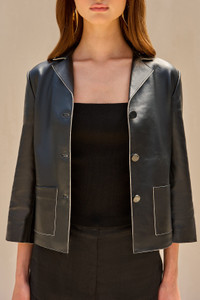 A raw edged lamb leather jacket designed with a worn feel and pocket details. — Raw edge lamb leather — Two pocket details — Button closure SIZE & FIT NOTES Model is 5'11" and is wearing a size 4 COMPOSITION AND CARE 100% LAMB LEATHER