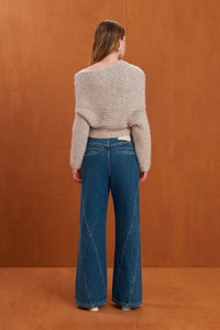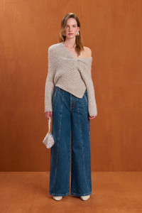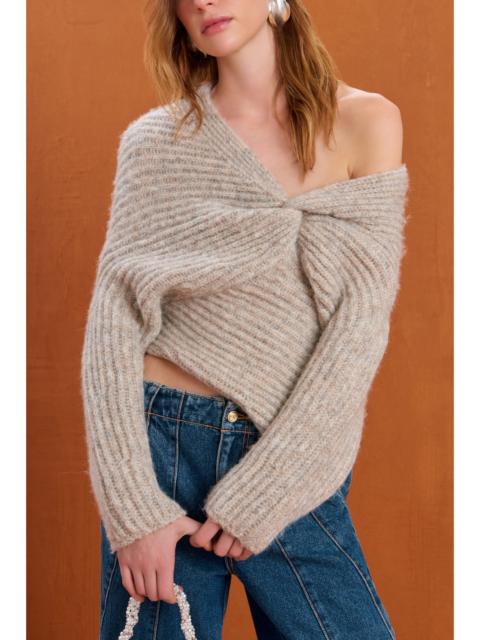 A long-sleeve wool blend knit sweater with an asymmetrical v neck with twist detail that is meant to be worn off the shoulder. — Long sleeve — Twist detail at bust — Asymmetrical hem — Worn off the shoulder SIZE & FIT NOTES Model is 5'11" and is wearing a size Small COMPOSITION AND CARE 53% WOOL 17% ALPACA 30% POLYAMIDE