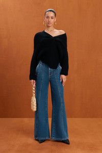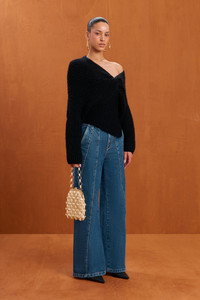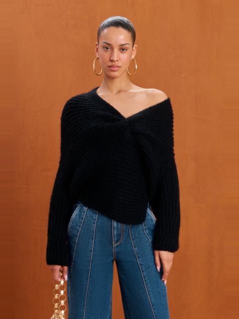 A long-sleeve wool blend knit sweater with an asymmetrical v neck with twist detail that is meant to be worn off the shoulder. — Long sleeve — Twist detail at bust — Asymmetrical hem — Worn off the shoulder SIZE & FIT NOTES Model is 5'10" and is wearing a size Small COMPOSITION AND CARE 53% WOOL 17% ALPACA 30% POLYAMIDE