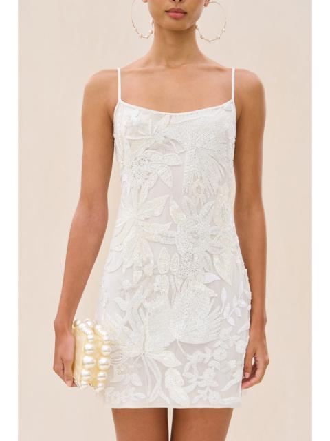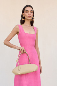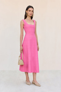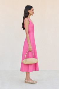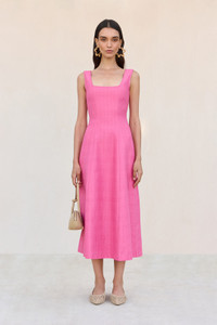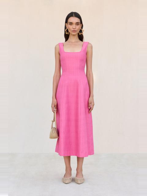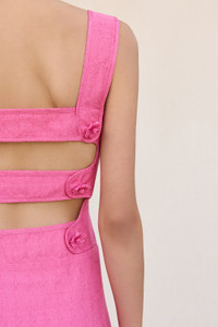 A caged back midi dress made in nubby faille with an a-line silhouette and acrylic flower details at the straps. — Midi length — Acrylic flowers — Nubby faille — Side zip — Fixed back straps