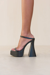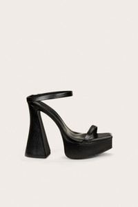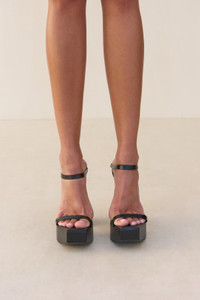 A square toe leather platform sandal with an open back. — Square toe — Platform sandal — Front ankle strap — 6.3" heel height SIZE & FIT NOTES 160MM HEEL HEIGHT COMPOSITION AND CARE UPPER: 100% COW LEATHER, OUTSOLE: 100% LEATHER, HEEL / PLATFORM: 100% ABS