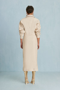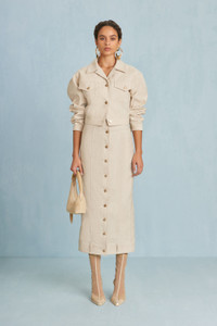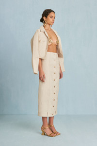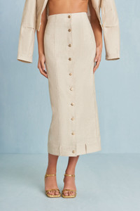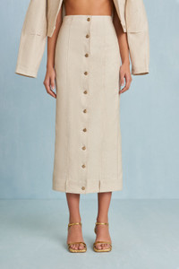 A neutral canvas high-waisted midi skirt with front button closure and non-functional belt detail at the hem. — Neutral canvas — Front button closure — Non-functional belt loop detail — High-waist SIZE & FIT NOTES Model is 5'10" and is wearing a size 4 COMPOSITION AND CARE 85% COTTON 15% LINEN