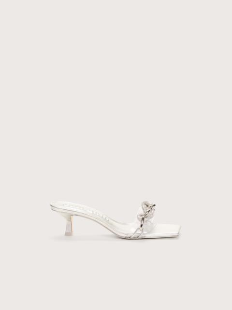 The Lynn sandal has a low heel and features a shinning chain over a clear vinyl strap. Each chain loop alternates from silver-toned to rhinestone encrusted link, offering a variety of shine. These sparking sandals are easy to pair with anything and sure to become a go-to in your collection. FIT NOTES Heel Height: 2" COMPOSTION AND CARE Upper: 100% Vinyl 100% Zinc Alloy / Plastic Outsole: 100% Rubber Heel: 100% ABS