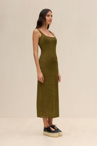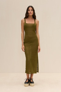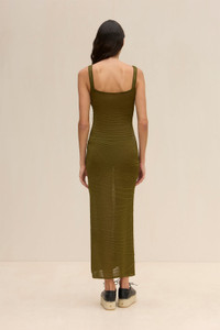 A semi-sheer coverup midi-length dress with abstract seam details throughout. — Midi length — Square neckline — Abstract seam details — Pull on style
