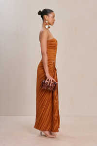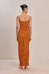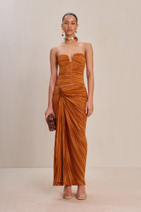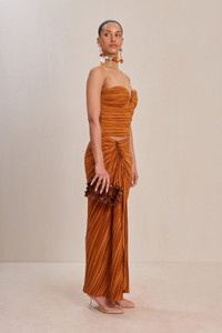 A strapless plisse top with a wired, plunging bust and center back zipper. — Strapless — Plunging neckline — Plisse fabric — Full length — Pair back to the Sonoma Skirt SIZE & FIT NOTES Model is 5'10" and is wearing a size 4 COMPOSITION AND CARE 100% POLYESTER