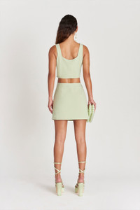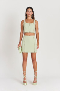 The Maro is a high-waisted mini skirt featuring a floral hardware embellishment on the two front seams of the skirt. Slight slits at the front give a touch of edge to an otherwise feminine silhouette. Meant to be, pair with the coordinating Oona Top for a very Gaia look. FIT NOTES Model is 5'10.5" and is wearing a size Small Floral hardware at right hip Slits at front Mini length COMPOSTION AND CARE 64% Polyester, 27% Viscose, 9% Elastane