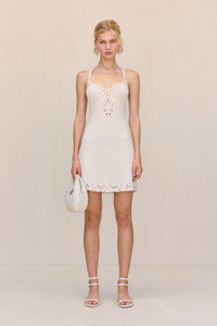 An artful knit mini dress with intricate embroidery detailing and cutwork. — Mini length — Soft cotton linen yarn — Embroidery at hems — Floral cutouts SIZE & FIT NOTES Model is 5'10" and wearing a size S COMPOSITION AND CARE 35% LINEN 45% BCI COTTON 20% CICLO POLYESTER