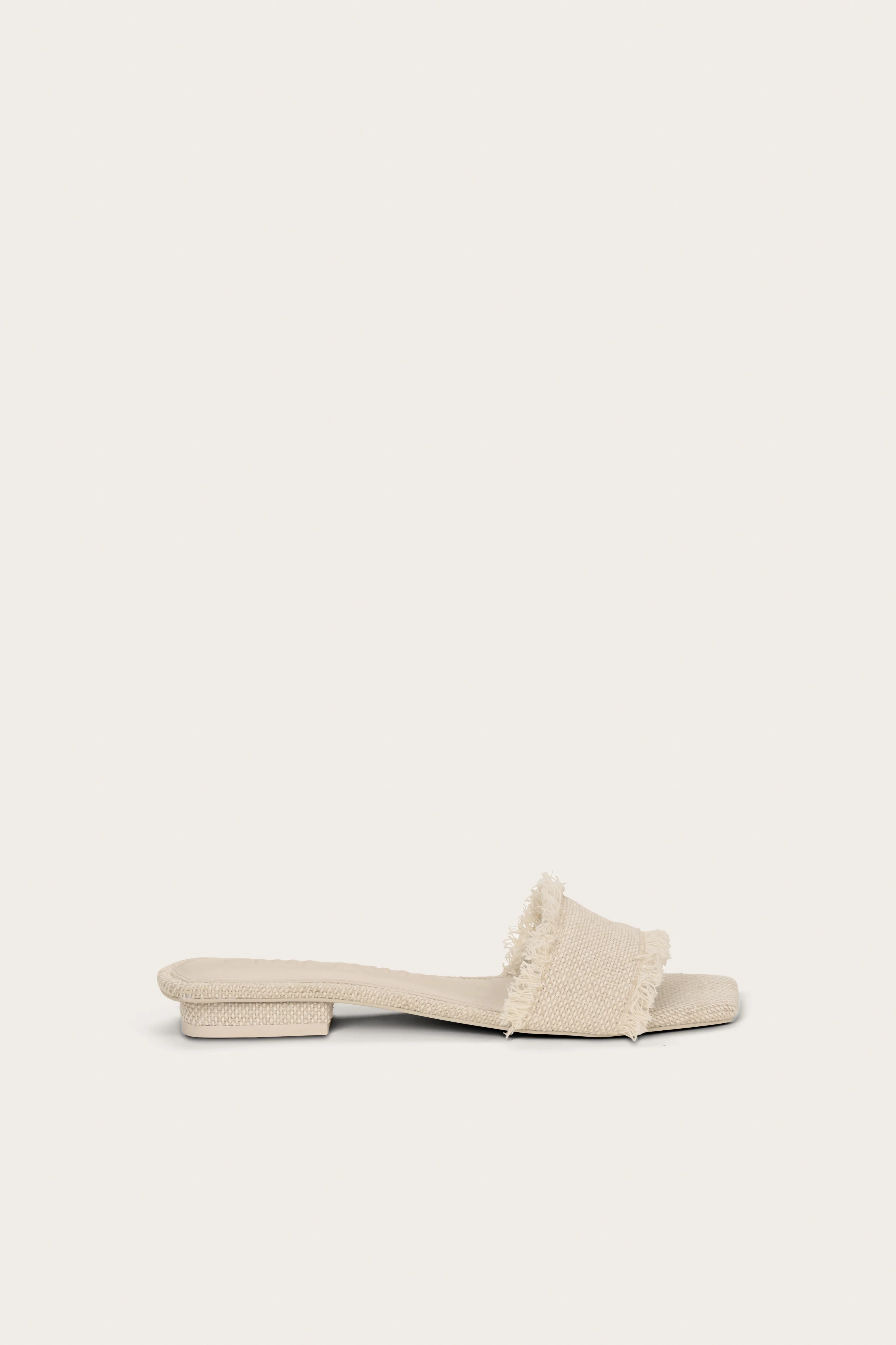 An everyday sandal fashioned out of woven raffia with frayed edge detailing. — Woven raffia — Leather sole — Square toe — Frayed edges on strap — Flat sandal — Runs small, we recommend sizing up 1 to 2 sizes SIZE & FIT NOTES Runs small, we recommend sizing up 1 to 2 sizes COMPOSITION AND CARE UPPER: 27% COTTON, 73% NATURAL JUTE, OUTSOLE: 100% RECONSTITUTED LEATHER