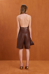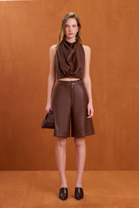 A vegan leather tailored bermuda short with zip fly, belt loops and seam details. — Above-the-knee length — Vegan leather — Zip fly — Belt loops — Front and back pockets SIZE & FIT NOTES Model is 5'11" and is wearing a size 4 COMPOSITION AND CARE 100% VEGAN LEATHER
