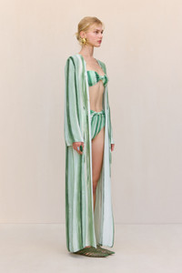 A floor length silk duster with an oversized silhouette and front tie closure. — Maxi length — Long sleeved — Oversized fit — Wear as a cover up SIZE & FIT NOTES Model is 5'10" and wearing a size S COMPOSITION AND CARE 92% SILK 8% SPANDEX