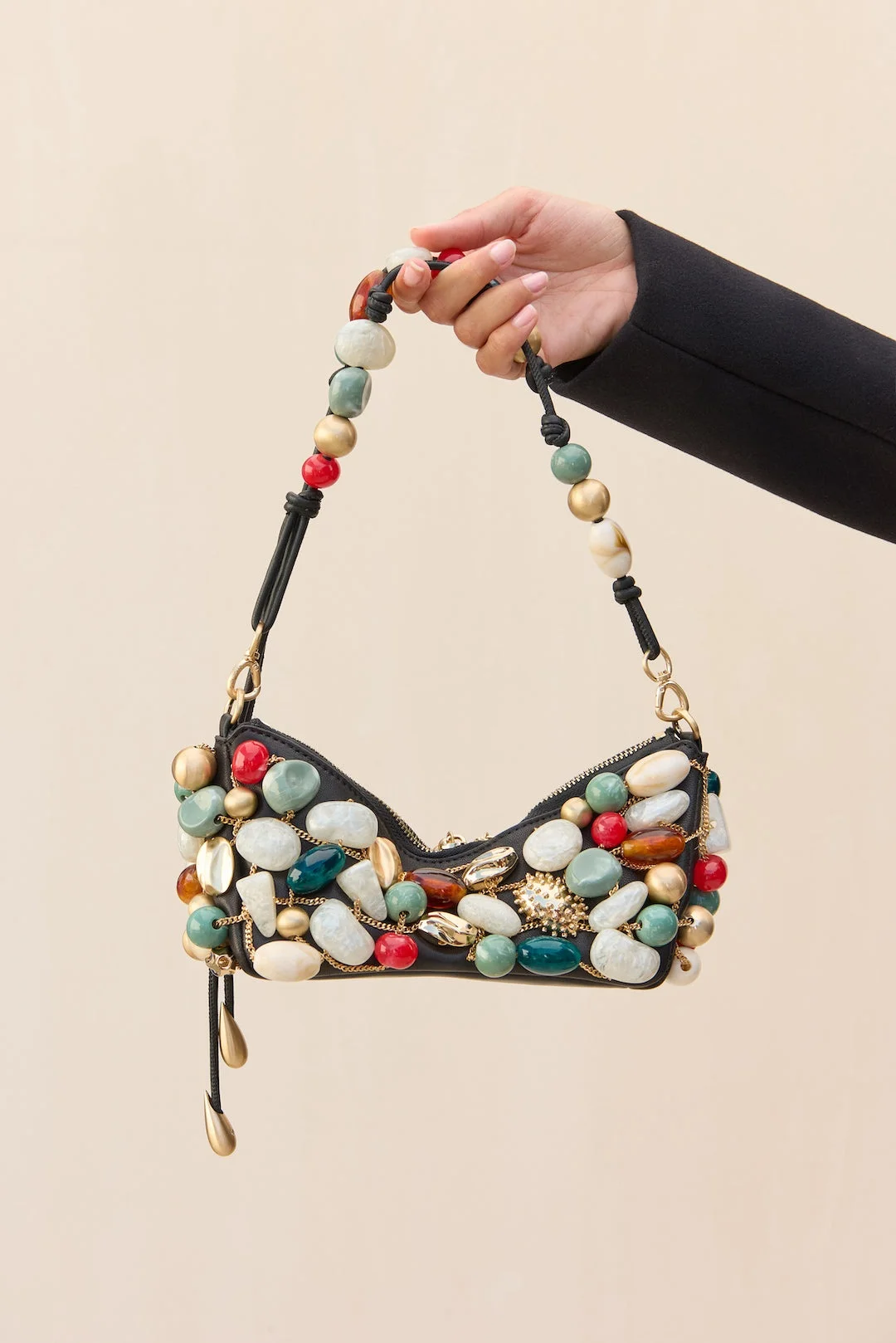 Preorder - Estimated Ship Date Between January 22nd and February 5th A butterfly-inspired convertible clutch adorned in stones and beads with a zipper closure. — Lambskin leather body — Baroque stone and beads — Woven gold chain details — Zipper closure SIZE & FIT NOTES 3.24" W x 10.11" L x 4.8" H x 9.4" HANDLE DROP COMPOSITION AND CARE BODY: 100% LAMB LEATHER TRIM: 100% ACRYLIC LINING: 100% POLYESTER