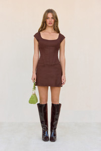 Preorder — Estimate ship date between November 22nd and December 6th A cotton poplin mini corset dress with a scoop neckline and center back zipper. — Mini length — Cap sleeves — Corset bodice — Center back zipper