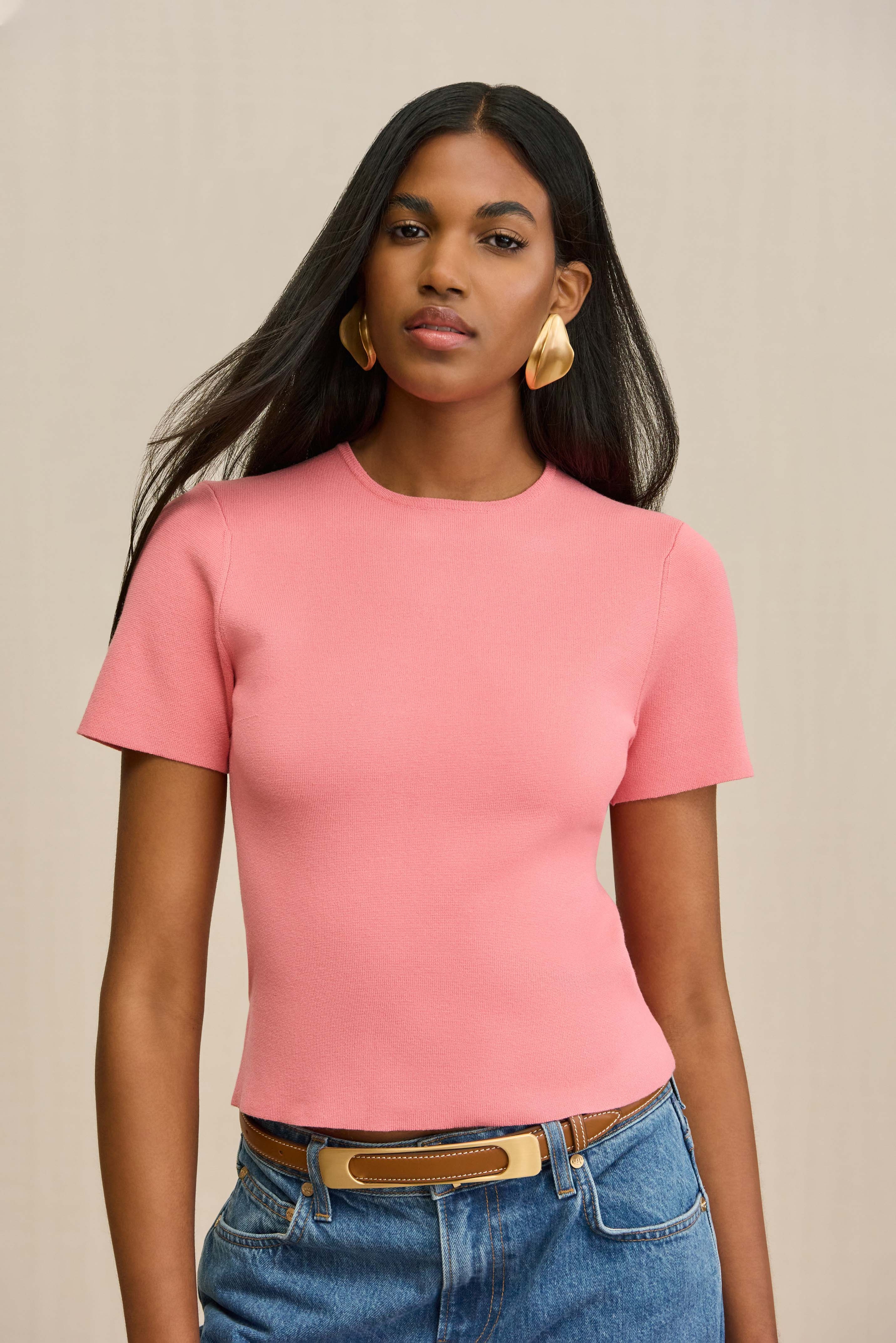 Preorder - Estimated Ship Date is Between June 16th and June 23rd The perfect elevated essential tee in a classic silhouette and a flattering ribbed fabrication. — Knit short sleeve — Crew neck — Ribbed fabrication — Can be worn as a set with the Sonoma Skirt SIZE & FIT NOTES Model is 5'10" and is wearing a size Small COMPOSITION AND CARE 65% VISCOSE 35% NYLON