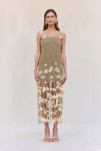 A breathtaking beaded gown with silk organza flower petal details. — Midi length — Objet d'art — All over beading — Silk organza flower petals — Side zipper