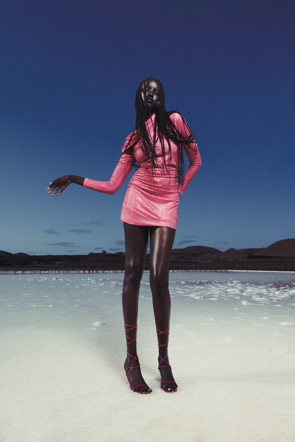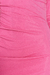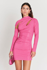 This bright-hued mini-dress with long sleeves features an innovative, high neckline that uses bands of jersey fabric to create a striking silhouette. One band of fabric wraps over the left shoulder, across the neck and skims over the right shoulder to tuck in the back. Another cutout at the left, front shoulder adds dimension and sophistication, while the openness of the right front and back, as well as the slimming sleeves, add drama. The rhinestone adorned body-skimming mini is meant to make an entrance. FIT NOTES Model is 5'10.5" and is wearing a size Small Bodycon fit Hotafix rhinestones throughout Asymmetrical neckline Stretchy fabric Unlined Style runs small, we recommend sizing up a size COMPOSTION AND CARE 82% Nylon, 18% Spandex