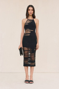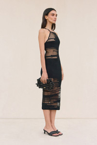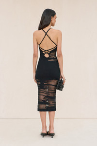 A fitted coverup knit dress designed in a transparent jacquard pattern with a narrow, high neckline and laced, low back. — Laced low back — Midi-length — Slip on, stretchy silhouette — Organza yarn