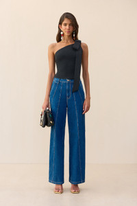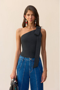 A one shoulder knit top with an exaggerated bow detail on the left shoulder. — Full length — Compact knit fabric — One shoulder design — Exaggerated bow detail SIZE & FIT NOTES Model is 5'10" and is wearing a size Small COMPOSITION AND CARE 100% POLYESTER