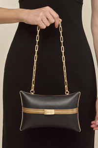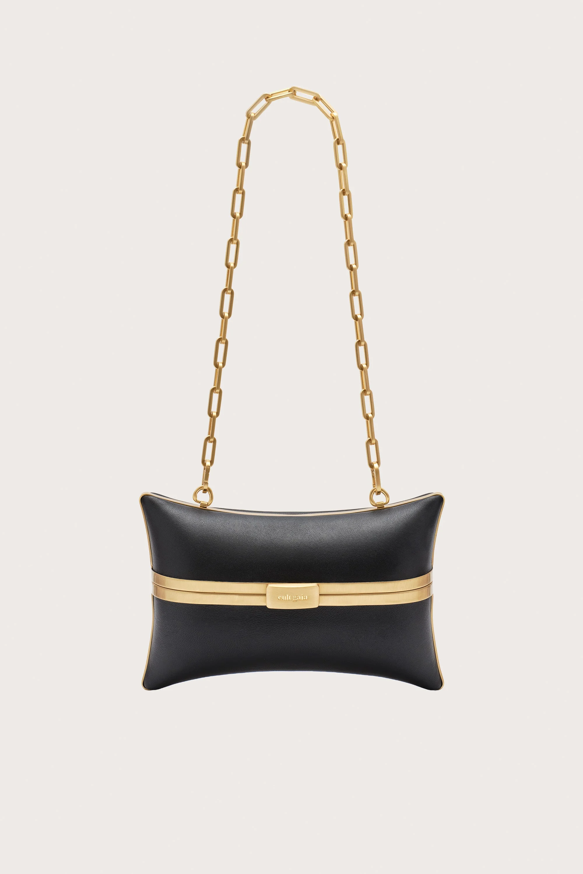 A black leather clutch resembling a puffed pillow with a removable chain strap. — Black leather — Front closure — Gold-toned hardware — Removable chain strap — Can fit an iPhone SIZE & FIT NOTES 2.75" W x 5.12" H x 8.46" L COMPOSITION AND CARE 100% SHEEP LEATHER; LINING:51% RECYCLE POLYESTER, 49% POLYESTER; HW: 100% ZINC ALLOY Wipe with a soft cloth to remove dust. Use a leather cleaner for deep cleaning. Apply leather protector spray to prevent water and stains.