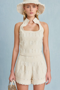 A high-waisted eyelash jacquard mini short with top pleats and a cuffed hem. — Eyelash jacquard — High-waisted — Mini length SIZE & FIT NOTES Model is 5'11" and is wearing a size 4 COMPOSITION AND CARE 68% COTTON 18% POLYESTER 8% VISCOSE 5% WOOL 1% ELASTANE