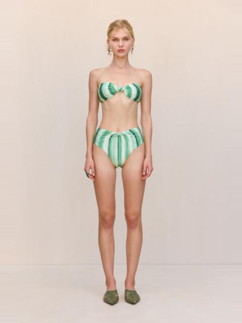 A bikini bottom with a knot detail in the front and medium coverage. — Mid to high rise — Knot detail in front — Shimmer tricot fabric — Double lined — Wear with Oswin Bikini Top SIZE & FIT NOTES Model is 5'10" and wearing a size S COMPOSITION AND CARE 80% POLYAMIDE 20% ELASTANE