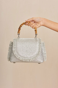 A mini-top handle bag with a woven raffia body, fringe trim detailing and bamboo-style handle. — Feet for display — Bamboo-style handle — Fringe detailing — Metallic coated raffia body FIT NOTES WIDTH: 3.94" HEIGHT: 5.71" LENGTH: 8.66" HANDLE DROP: 2.91" COMPOSTION AND CARE 52% COTTON, 48% POLYAMIDE, TRIM: 100% COW LEATHER, LINING: 90% POLYESTER 10% POLYURETHANE