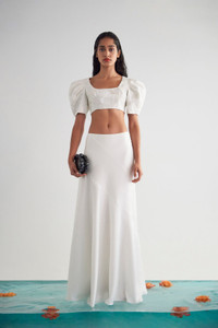 The Pelli is a floor-length skirt in a heavenly hammered air satin. This graceful fabric is embellished with bias-seam detail to flatter the feminine figure. The material enriches movement and demands attention. Wear the Pelli for a truly unforgettable look that combines flamboyance with elegance. FIT NOTES Model is 5'9" and is wearing a size Small Flared skirt Center back zipper Fitted waist Fully lined COMPOSTION AND CARE 92% Silk, 8% Spandex