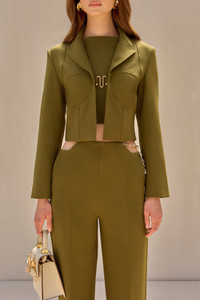 A lightweight crepe jacket designed with signature wave-shaped hardware at the bust and traditional zipper closure, wear open or closed. — Lightweight crepe — Front bust boning — Zipper closure — 3/4 length FIT NOTES Model is 5'11" and is wearing a size 4 COMPOSTION AND CARE 96% POLYESTER 4% SPANDEX