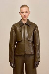 A timeless collared leather jacket with layered details and an exposed zipper front. — Leather — Exposed zipper — Collared silhouette — Wear as a set with the Juji Top and Dalton Pant SIZE & FIT NOTES Model is 5'10" and wearing a size Small COMPOSITION AND CARE 100% LAMB LEATHER